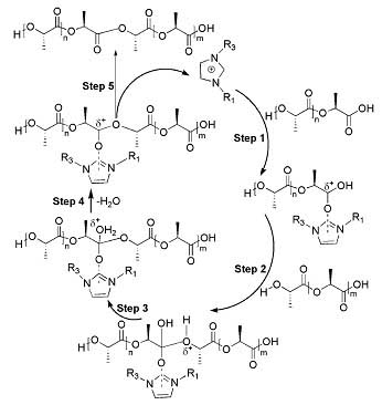 Melt Polycondensation of L-Lactic Acid Catalyzed by 1,3-Dialkylimidazolium Salts,
