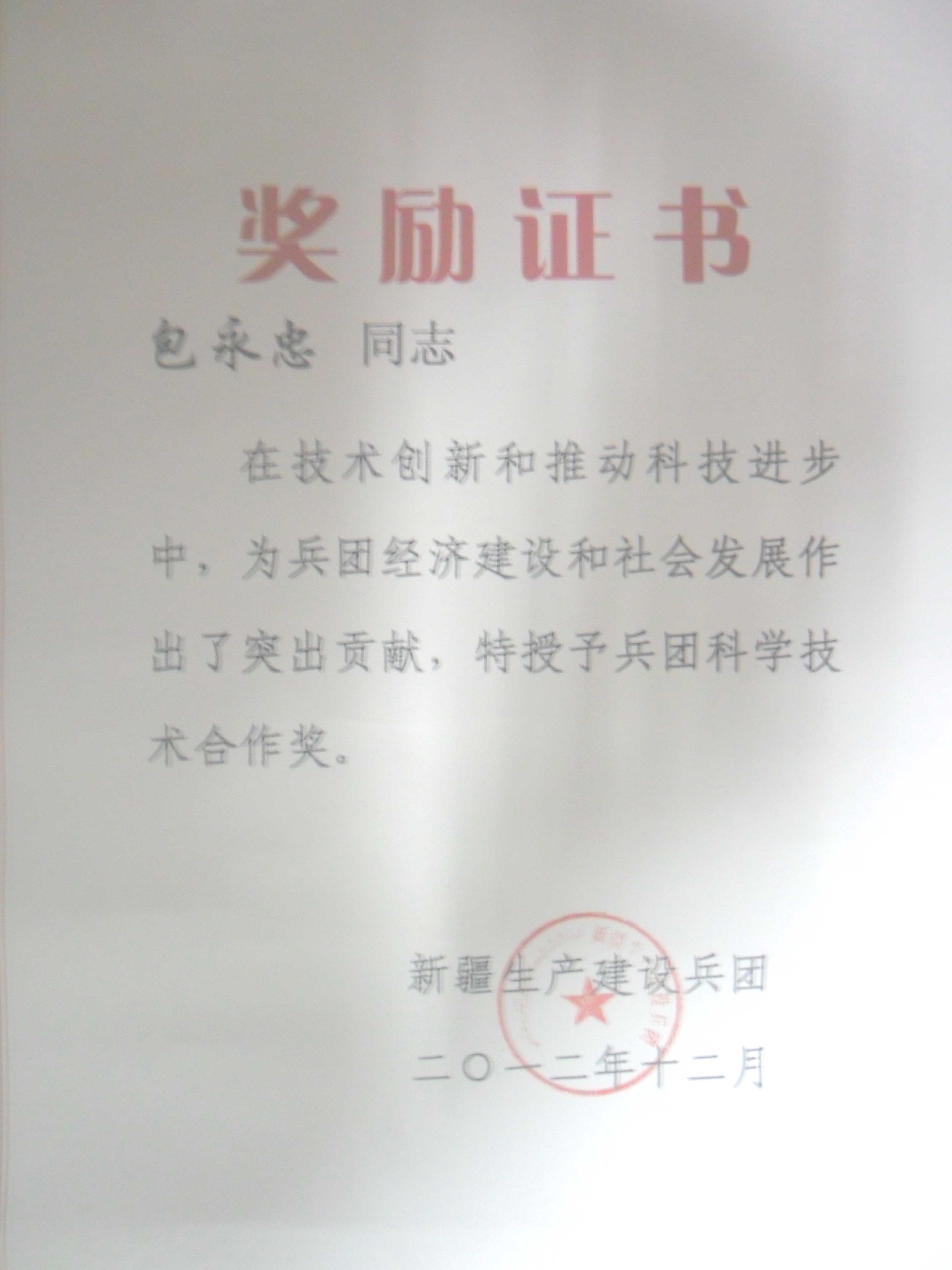包永忠教授获新疆生产建设兵团“兵团科学技术合作奖”