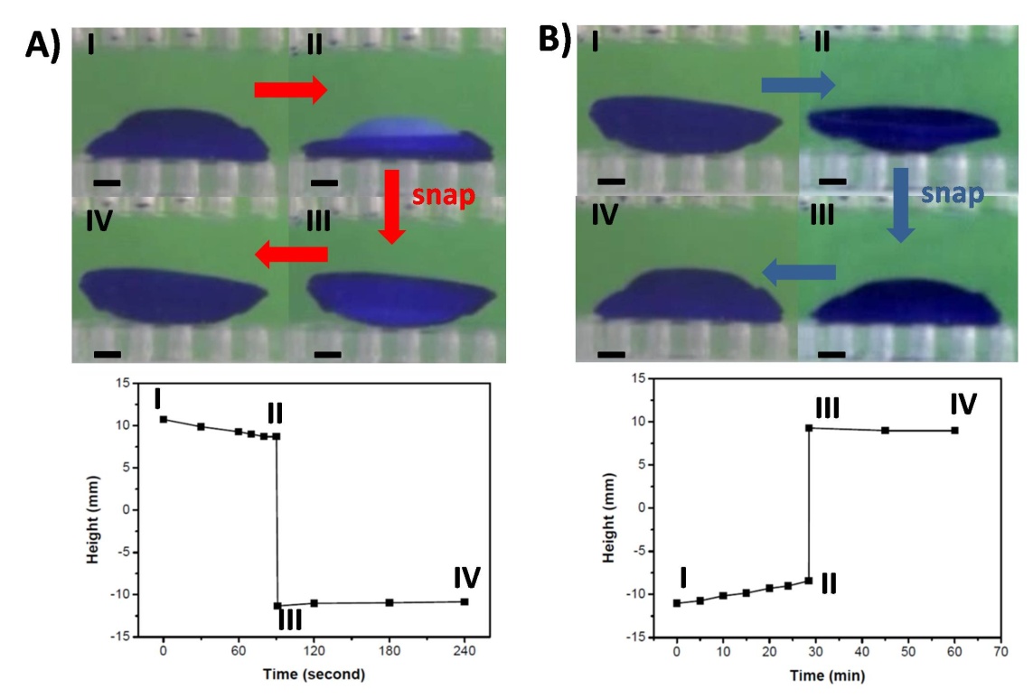 另一方面,自然界显示出了一些与之不同的奇妙现象。例如捕蝇草捕食昆虫的过程,就是由慢变快的非连续突变过程(图1)。其原理是捕蝇草叶片具备机械失稳的翘曲结构。受到这种结构的启发,本课题组与力学系李铁风副教授课题组合作,以环境敏感水凝胶为切入点,构造了一种可实现可逆非连续突变的智能材料结构。在前期基于超分子粘结的水凝胶模块组装(Advanced Materials, 2014, 26, 5565)的工作基础上,研究者将预拉伸后的环境敏感水凝胶进行模块组装,构筑了具有弹性能垒的双稳态水凝胶结构。环境条件变化时,水凝胶组装体在翻越弹性能垒的过程中,发生缓慢的形变;一旦越过能垒,组装体将发生快速变形,从而实现非连续突变。更重要的是,在不同刺激条件下,组装体的突变可以不断地被可逆触发,而这比捕蝇草的非可逆突变又更进了一步(图2与图3)。该研究在近期的Materials Horizons(DOI: 10.1039/C6MH00167J)上发表,被选为当期的内底封面,并被Chemistry World与Scientific American等媒体报道。