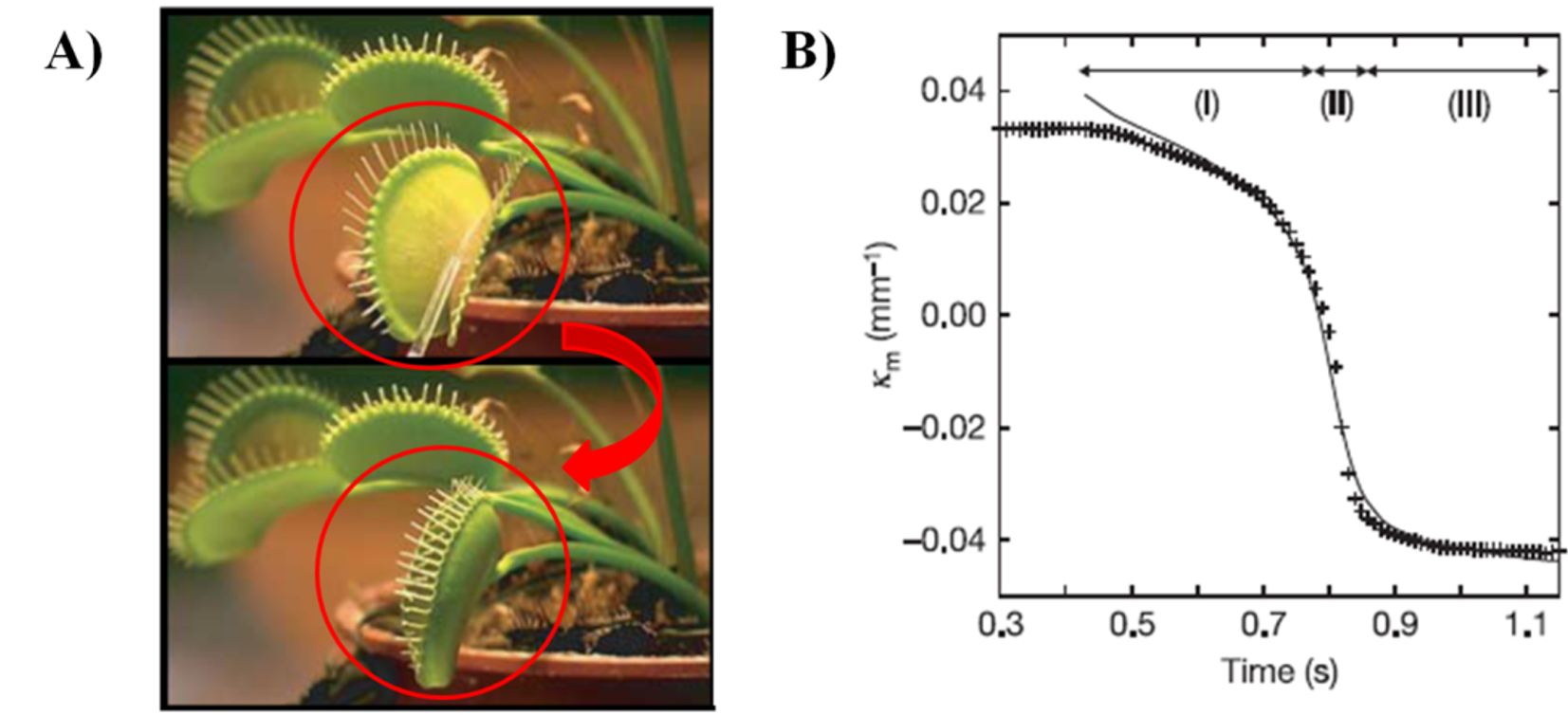 图1. 基于机械失稳的捕蝇草非连续突变捕蝇过程(Forterre Y, et al., Nature, 2005, 433, 421)