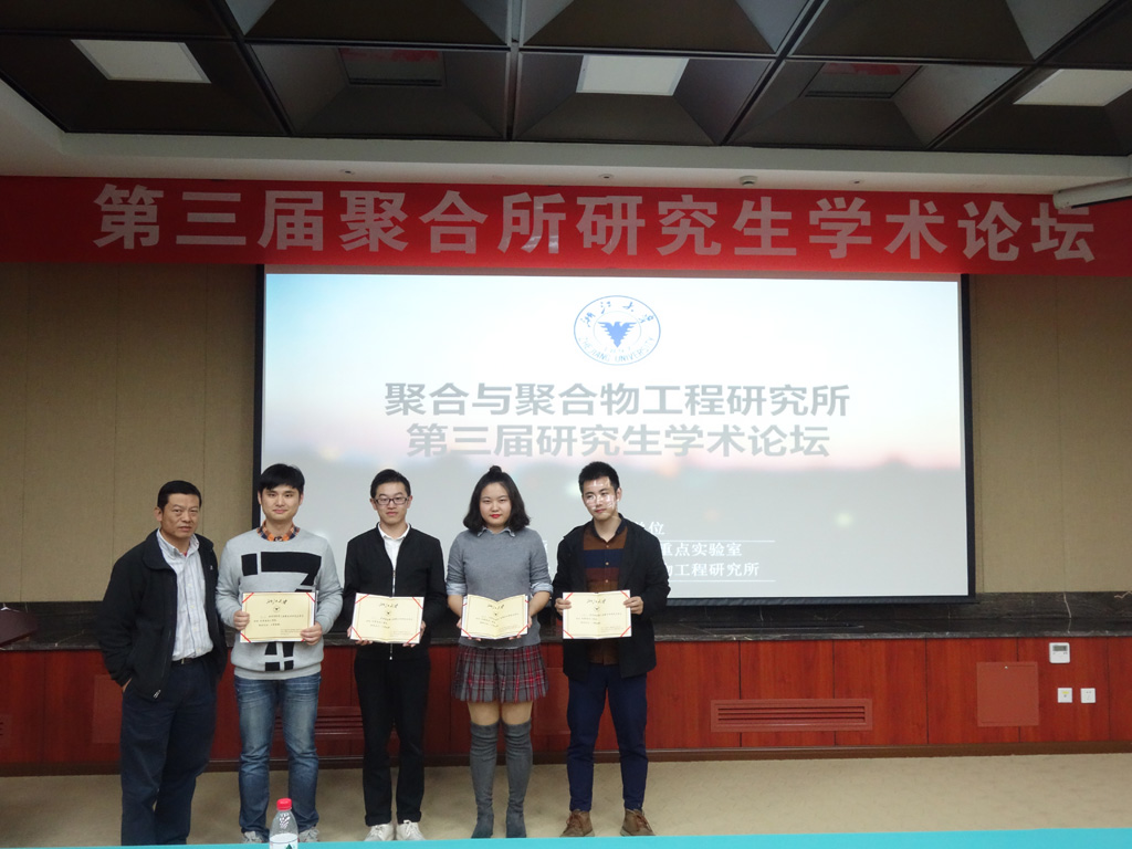 在2017年浙江大学聚合与聚合物工程研究第三届研究生学术论坛中,课题组学生陈狄、金斌杰获优秀报告奖二等奖,杨立鹏、张国高获优秀墙报奖。