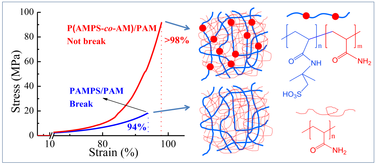 一般,水凝胶的力学性能较差。本课题组制备了一种新型水凝胶,该水凝胶的压缩强度大于91.8 MPa、压缩应变98%尚未破裂(仪器极限),是目前报道压缩性能最好的水凝胶。具体详见论文Luyi Wang, Guorong Shan*, Pengju Pan. Soft Matter, 2014, 10: 3850-3856。