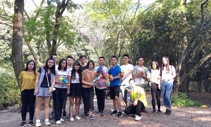 我们首先去九溪十八涧进行室外游戏,我们准备了各具特色的玩具水枪。等大家徒步走到小溪潺潺的林中时,便畅快地玩耍起来,一度被水淋湿全身。大家很快打成一片,其乐融融。在休息时刻,组内所有成员进行了自我介绍,大家在说说笑笑中度过了难忘的下午。