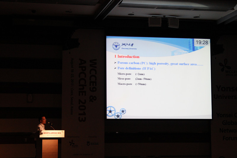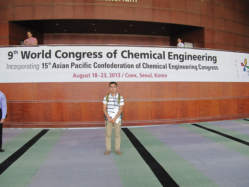 2013年8月18日至8月23日,包永忠教授和博士生杨杰参加了在韩国首尔举行的第九届世界化学工程大会。包永忠教授在Process and Technology for Energy and Environment I – Yonsei ChE Global Network Forum分会场做了题为Preparation of Meso-microporous Carbons based on Vinylidene Chloride Copolymers via Templating Method的口头报告。博士生杨杰在Sustainable development for future Society分会场做了题为Synthesis of Vinylidene Chloride Block Copolymers Via RAFT Copolymerization的墙报报告,报告内容均得到参会人员的好评。