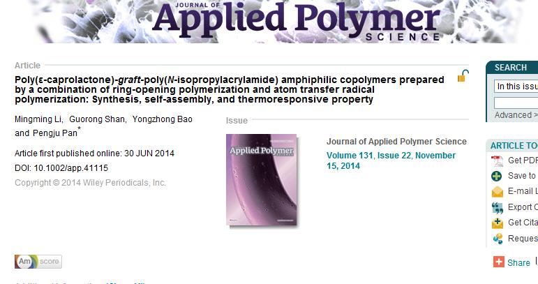 Li mingming's paper Poly(epsilon-caprolactone)-graft-Poly(N-isopropylacrylamide) Amphiphilic Copolymers Prepared by a Combination of Ring-Opening Polymerization and Atom Transfer Radical Polymerization: Synthesis, Self-Assembly, and Thermoresponsive Property is published on J. Appl. Polym. Sci.