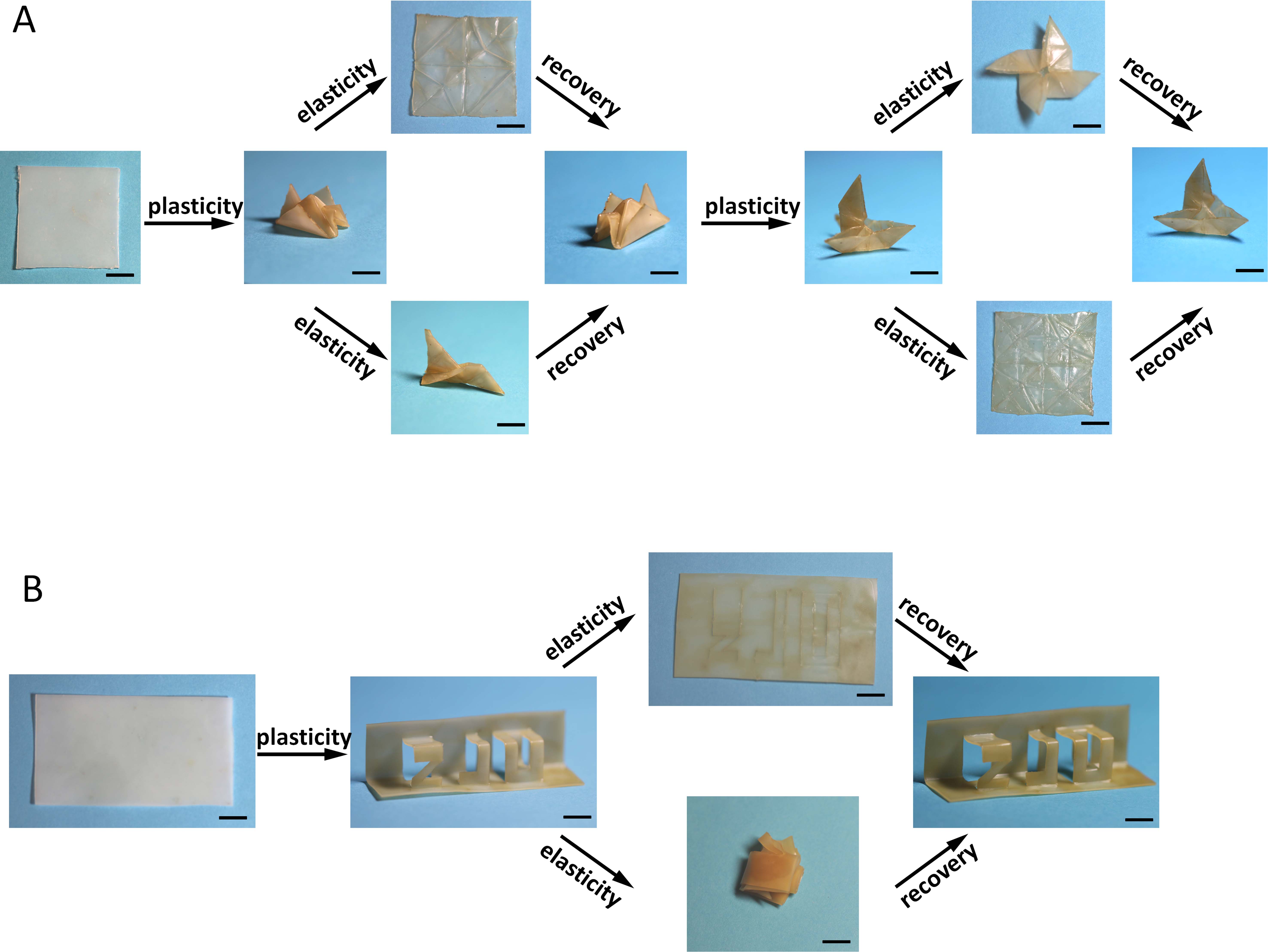 Stimuli-responsive materials with sophisticated yet controllable shape-changing behaviors are highly desirable for real-world device applications. Among various shape-changing materials, the elastic nature of shape memory polymers allows fixation of temporary shapes that can recover on demand, whereas polymers with exchangeable bonds can undergo permanent shape change via plasticity. We integrate the elasticity and plasticity into a single polymer network. Rational molecular design allows these two opposite behaviors to be realized at different temperature ranges without any overlap. By exploring the cumulative nature of the plasticity, we demonstrate easy manipulation of highly complex shapes that is otherwise extremely challenging. The dynamic shape-changing behavior paves a new way for fabricating geometrically complex multifunctional devices.