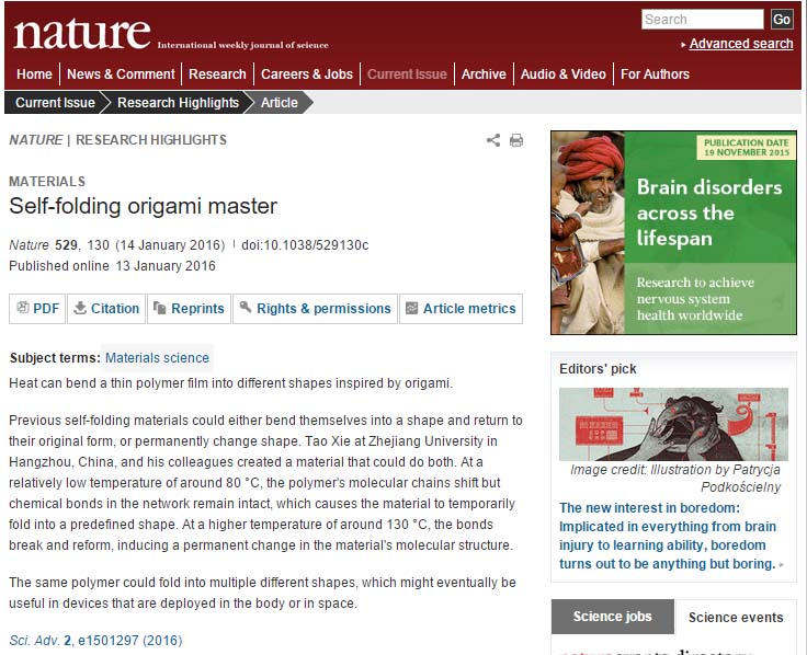 This work was published on Science Advances (the offspring of Science) on Jan. 8, 2016, and was soon reported by a number of highly influential medium including Wall Street Journal, Science News, CCTV, and so on. In special, Nature released a research highlight on Jan. 14 issue (Nature, 529, 130). Links of selected reports about the work were listed as below.