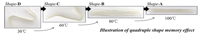 Shape memory polymer, as a stimulus-responsive smart material, can change several shapes macroscopically via external stimulus in a pre-defined programming way. More shapes they can memorize, more complicated actions can be fulfilled. As a result, the multi-shape memory polymer was believed to have significant and broad technology impacts.