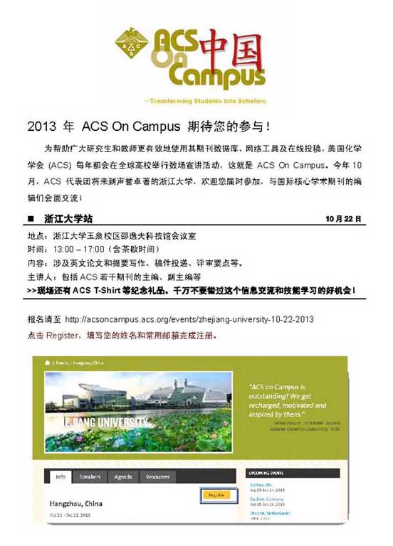 美国化学会(ACS)组织了包括《Analytical Chemistry》主编J.Sweedler教授和《Ind & Eng Chem Res》副主编李伯耿教授在内四位成员,将于10月22日下午在我校玉泉校区邵科馆开展宣讲活动,主要涉及英语论文及其摘要的写作、网上投稿、论文评审等。活动的具体时间、地点、宣讲人介绍及网上报名请访问(http://acsoncampus.acs.org/events/zhejiang-university-10-22-2013)。活动现场还有ACS T-Shirt等纪念礼品。