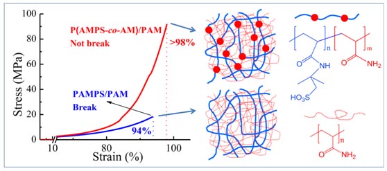 一般,水凝胶的力学性能较差。本课题组制备了一种新型水凝胶,该水凝胶的压缩强度大于91.8 MPa、压缩应变98%尚未破裂(仪器极限),是目前报道压缩性能最好的水凝胶。具体详见论文Luyi Wang, Guorong Shan*, Pengju Pan. Soft Matter, 2014, 10: 3850-3856。