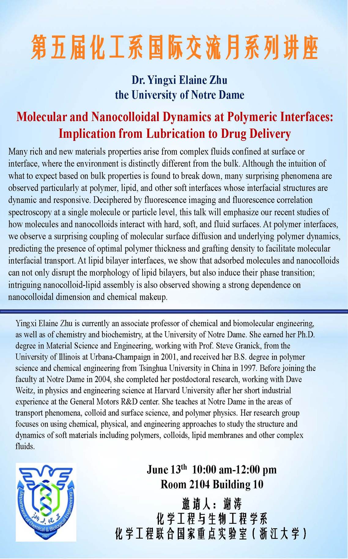 第五届化工系国际交流月系列讲座-Dr. Yingxi Elaine Zhu