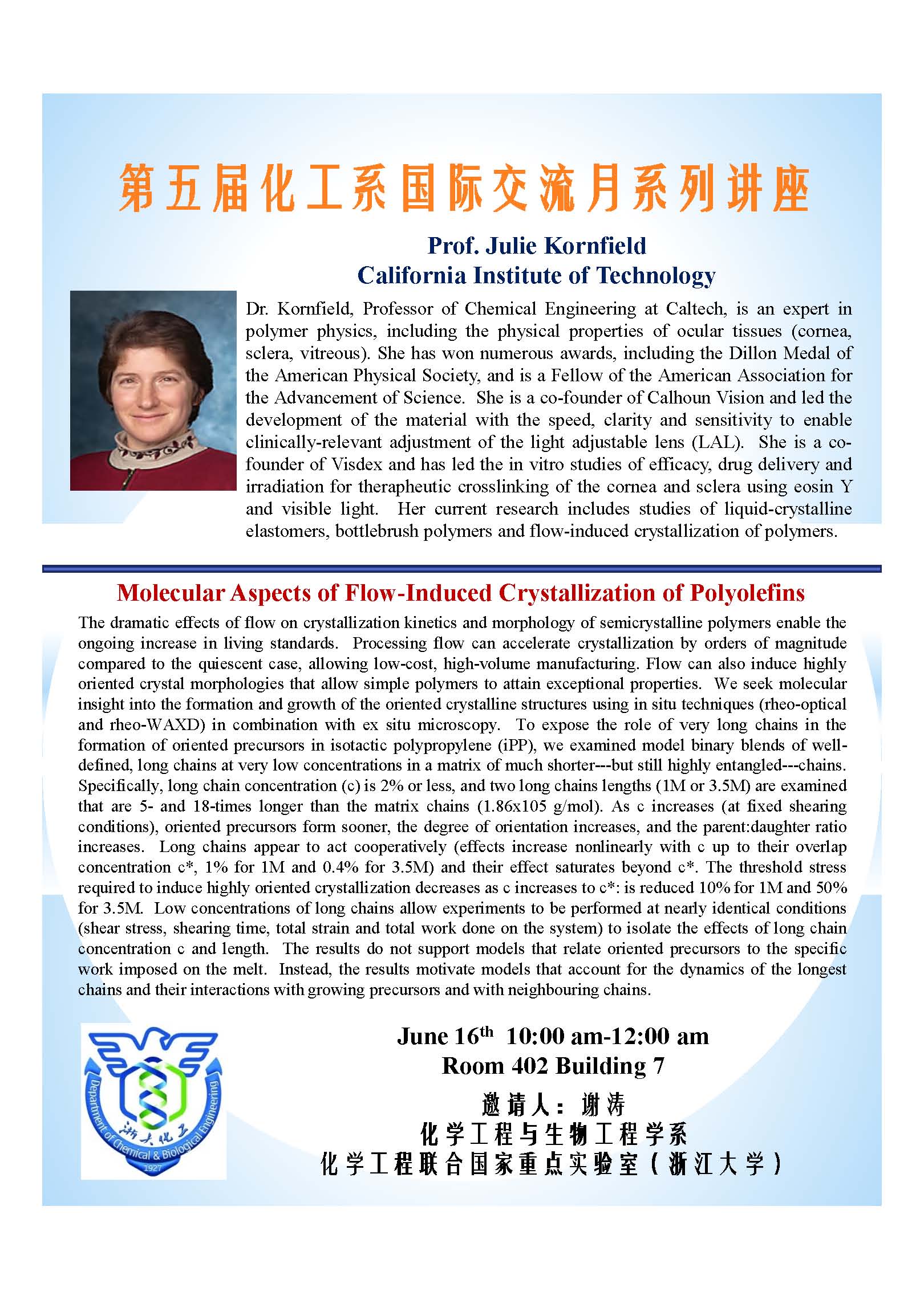 第五届化工系国际交流月系列讲座-Prof.Julie Kornfield
