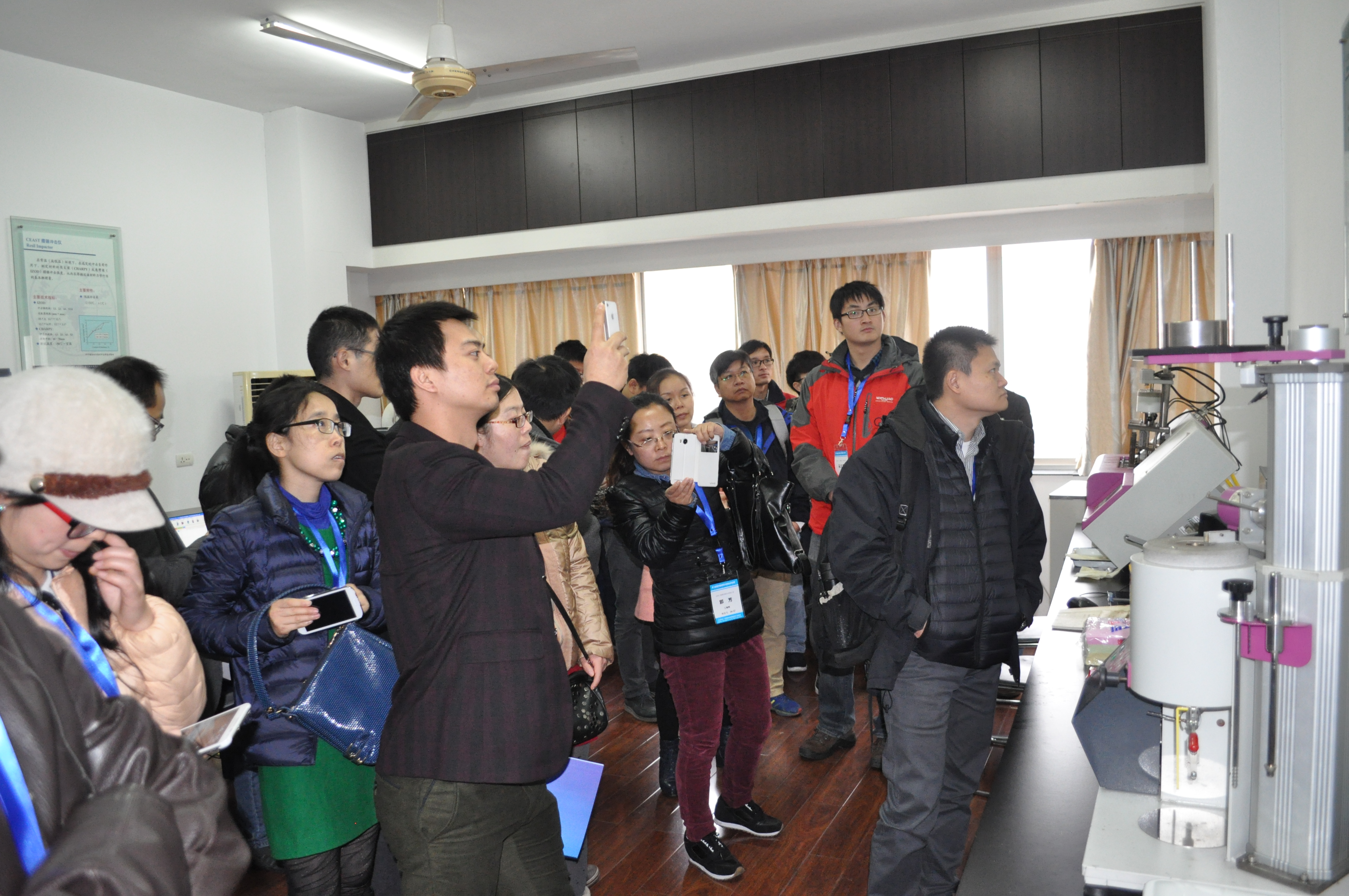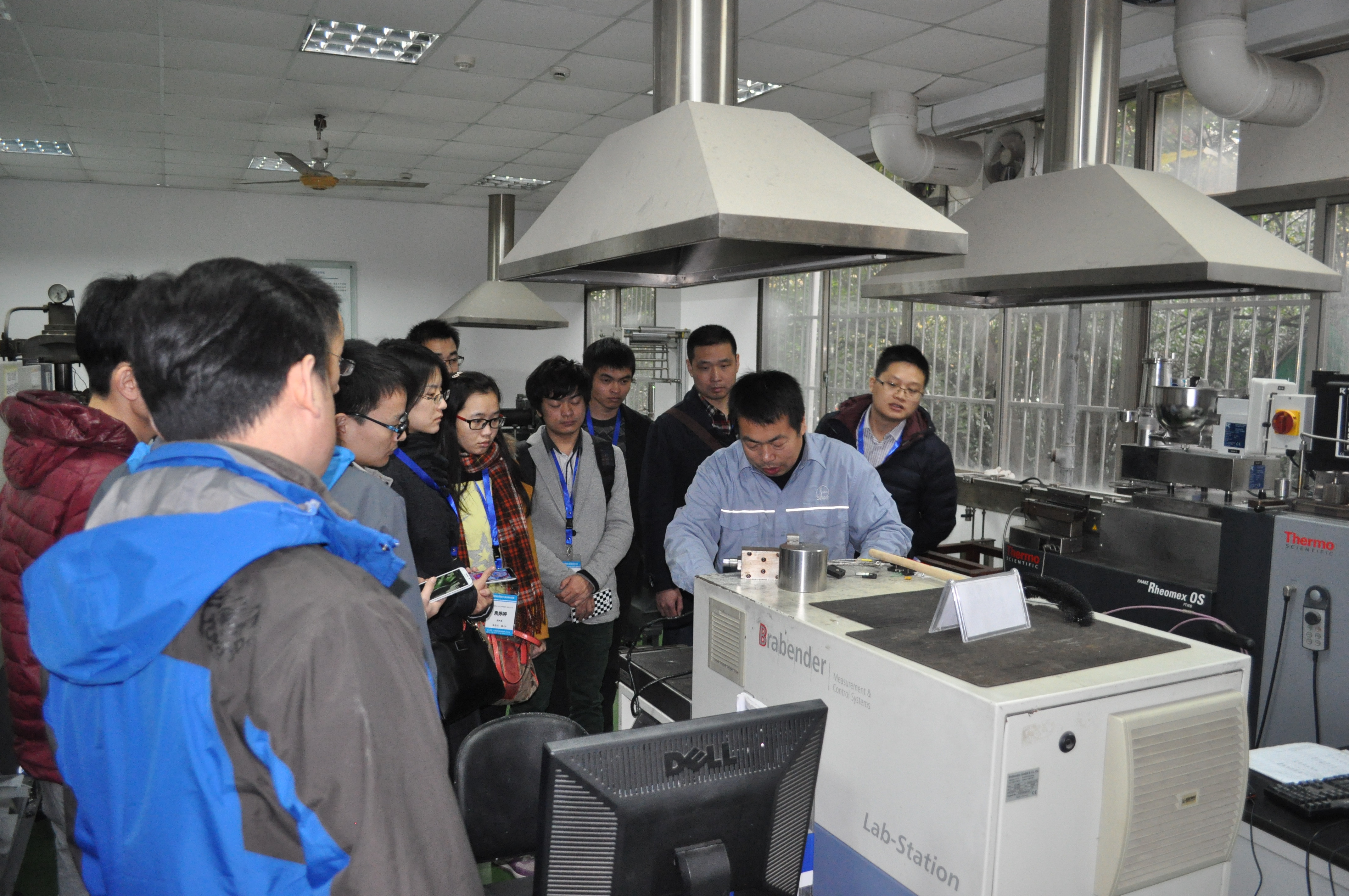 2014年12月8~12日,由中国胶粘剂和胶粘带工业协会举办的《第二届胶粘剂基础知识与粘接技术培训班 》在杭州举行。10日下午,培训班重点内容“实验室实习和操作培训”由本室固定人员、协会理事长范宏教授牵头到重点实验室浙大分室进行学习交流。160多名来自全国各地的胶粘剂研发人员在中国胶协杨栩秘书长的带领下,分成2批来实验室参观学习。
