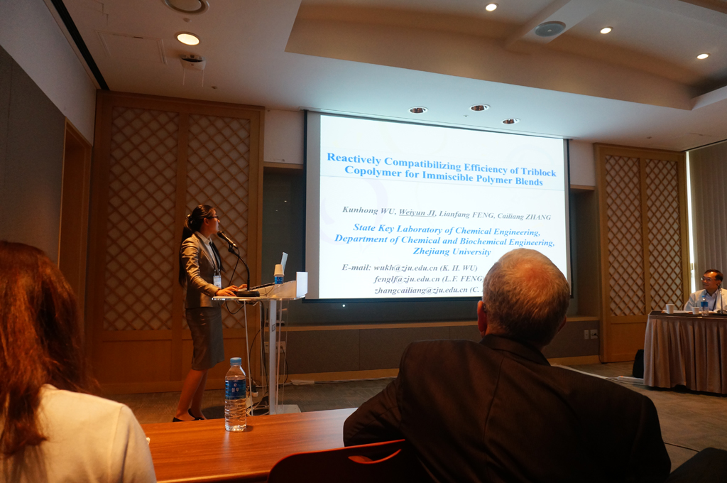 化学工程联合国家重点实验室(浙江大学)的三位博士研究生参加了PPS31会议。博士生季薇芸分别在聚合物共混分会上作了题为“Reactively Comaptibilizing Efficiency of Triblock Copolymer for Immiscible Polymer Blends”和“Concept of Reactive Compatibilizer-tracer for Discovering Interfacial Reaction and Morphology Development during In-situ Compatibilizing Blending Processes”的报告。博士生李聪在聚合物发泡分会上分别作了题为“Bimodal Polystyrene Nanocomposite Foam via Two-step Depressurization Method ”和 “Foaming Behavior of the Multilayered PS/PA6 Blend and Its Anisotropic Mechanical Properties”的报告。博士生唐寅在聚合物薄膜和纤维分会上作了题为“Formation of Bead-free Fibers of PS via Electrospining Using PA6 or PA6/PS-co-TMI as Additives”的报告。
