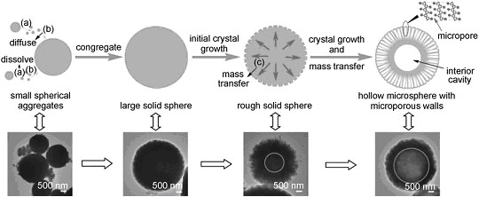 该论文报道了采用一釜水热反应法制备具有微孔壳层的中空配位聚合物微球,发现该类聚合物微球形成的机理为:配位聚合物先成核并聚集成较大的实心微球后,由于表面能的作用,内部微晶逐步溶解并向外扩散,从而形成中空结构。此类具有微孔壳层的中空配位聚合物微球在储氢、药物控释、催化剂载体等方面有很好的应用前景。