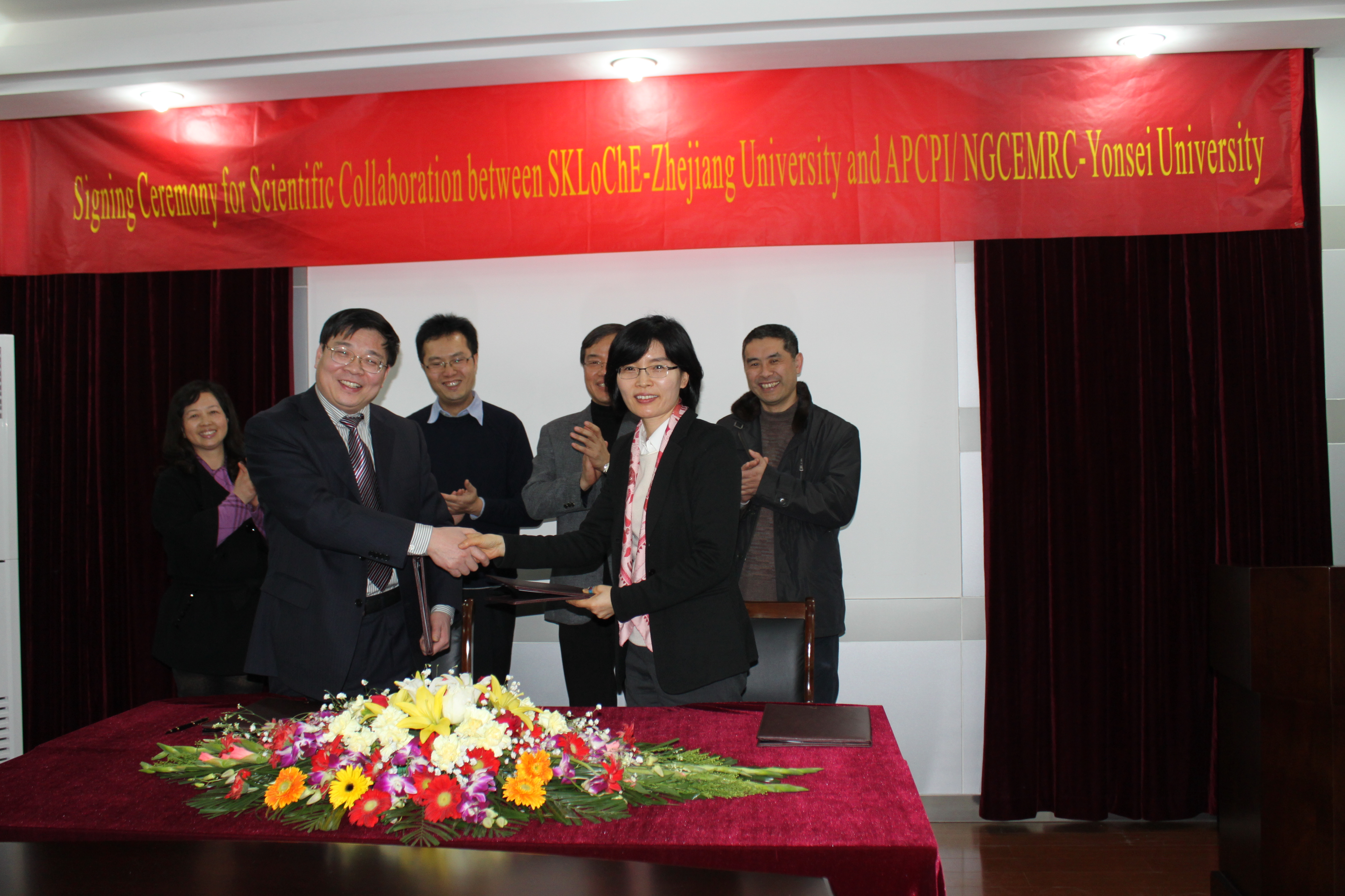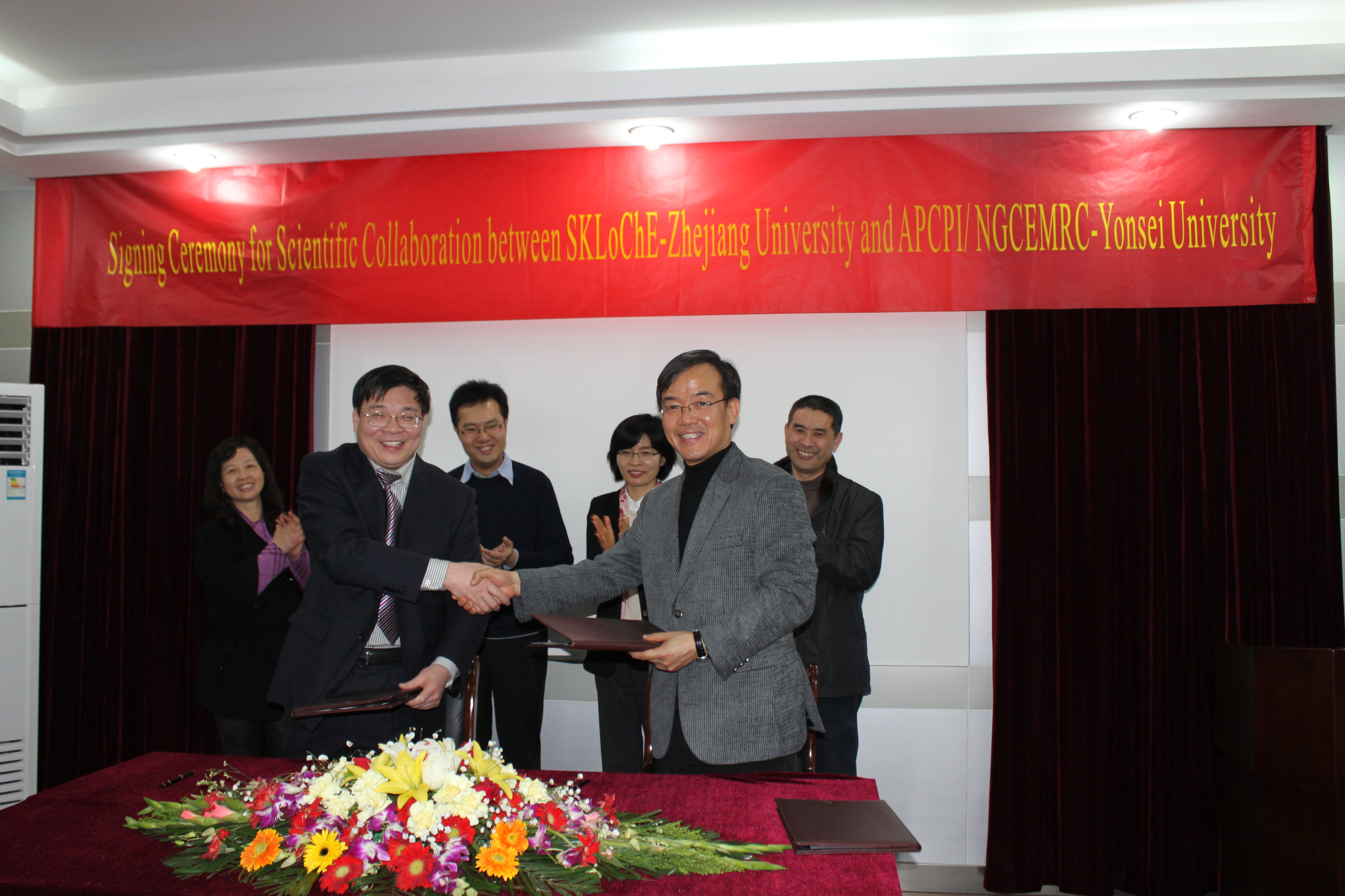 2012年2月13日,韩国延世大学(Yonsei University)化工系一行来我系进行访问和交流。双方就能源、环境、材料、生物等多个领域展开了深入的探讨和学术交流,两校教授对彼此的研究方向有了更深的了解,为日后开展科研合作和技术交流奠定了基础。交流会后,浙江大学化学工程联合国家重点实验室(SKLoChE)分别与延世大学活性聚合物成型整合中心(APCPI)、延世大学新一代融合能源材料研究中心(NGCEMRC)签署了科研合作的协议,工学部主任李伯耿教授出席了签约仪式。参加此次交流会的有:浙江大学化工系国际交流与合作委员会主任王文俊教授、罗英武教授、吴素芳教授、林东强教授、刘振副教授、延世大学化工系Eunkyoung Kim教授、Chang-Ha Lee教授、Du Yeol Ryu教授、Jong Hak Kim教授、Jae-Hyung Jang助理教授。