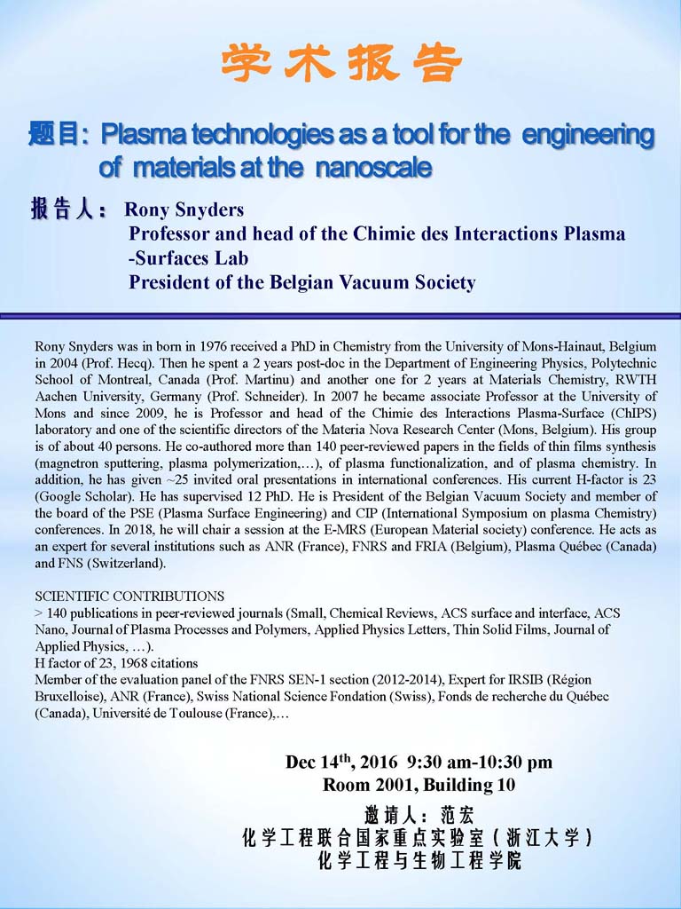比利时蒙斯大学Rony Snyders教授学术报告