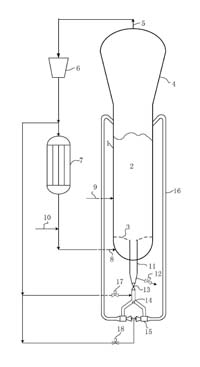 专利简介: 本发明是一种烯烃聚合流化床反应装置及烯烃聚合方法。本发明的气体分布板(3)由周边的环状孔板区(19)、中心的筒状下料区(21)、以及连接环状孔板区(19)和筒状下料区(21)的锥型区(20)三部分组成;所述的循环回路由垂直立管(11),气固喷射器(15)和气力输送管(16)构成。所述的循环回路的数量为2-8 个;所述的循环回路沿流化床轴线对称分布。本发明克服了现有技术中循环回路侧面单管进料导致的不均匀性以及锥形分布板侧面出气容易产生死区等缺陷,为烯烃聚合流化床反应装置及烯烃聚合方法带来了独创而有益的革新。